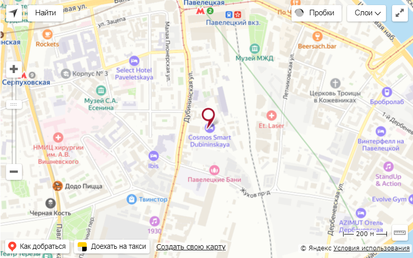 Проживание по специальному предложению можно забронировать в отеле "Cosmos Smart Dubininskaya", который находится по адресу: